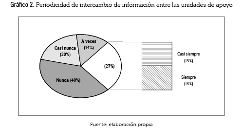 El gráfico anterior muestra con más claridad el diagnóstico que ya ha sido esbozado. Como se ve allí, la información interna del concejal, la de la misma alcaldía, y la de redes individuales tiene más relevancia que la de actores como universidades, ONG, observatorios, y agremiaciones. Esto implica, como ya señalaba Barberena (2010, p. 69) para todos los Concejos del país, que ''los debates y propuestas que surgen en el seno de estas corporaciones son muy pobres y se anteponen claramente prioridades particulares a debates sobre el bien general''. Lo anterior implica que los secretarios y técnicos de la alcaldía eran capaces de superar los argumentos de los concejales, ya que los primeros cuentan con un gran equipo técnico de apoyo, mientras que los segundos, no. Al indagar por este desbalance técnico, se evidenció que más de la mitad de las unidades de apoyo entrevistadas (54 %) guardan la información en un archivo único de trabajo, pero que es exclusivo a cada concejal (puede ser visto por su equipo), y el otro porcentaje (46 %) guardan la información en archivos personales. En ese mismo sentido, al preguntarles a los equipos si estos compartían información sobre las investigaciones, el 40 % señaló que no lo hacía nunca y el 34 % que casi nunca. Esto implica que solo un 27 % de los equipos de los concejales comparte algo de información entre sí, lo que demuestra el mencionado aislamiento.