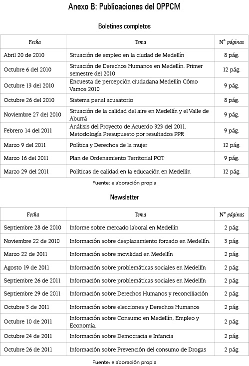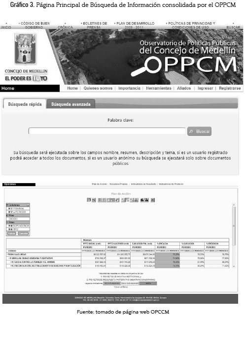 Este rumbo continúa durante 2010, período en el que el OPPCM alcanza relaciones con 36 entidades que producen información en la ciudad. Inicia también un diagnóstico de la entidades productoras de información de la ciudad (30 entrevistados) (ver Leyva y Tabares, 2011). Recolecta más de seiscientos documentos y más de 6500 páginas de información de ciudad. Esto implicó que el Concejo empezara a contar con una base de datos de ciudad que reunía información independiente y actualizada. En ese mismo sitio web, sistematiza la información de ejecución presupuestal y de seguimiento al Plan de Desarrollo, de manera tal que los equipos de los concejales y los observatorios de la ciudad puedan efectivamente acceder a una herramienta de seguimiento cuantitativo.
