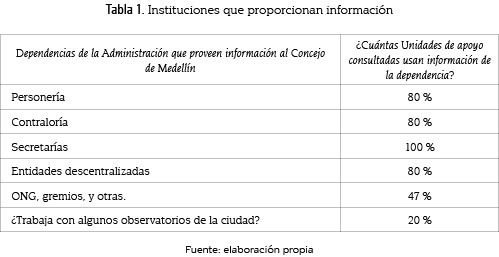 En cuanto a la información formal2 que examinaban estos equipos en 2009 se puede señalar que esta se limitaba a la que arrojaban los motores de búsqueda en línea y a la que proveía la Administración municipal de Medellín a través de un cuestionario que el mismo Concejo les enviaba a los funcionarios con quince días de anterioridad a la plenaria. Destaca que solo dos equipos utilizan memorias de eventos, y solo cuatro, informes de prensa. Esto arroja un panorama donde el Concejo se presenta aislado de las redes de gobernanza local y hasta ese momento muy centrado en la información que viene desde la misma administración, o desde las redes de contacto interpersonales de los concejales y equipos de apoyo. Dentro de esta información oficial resalta que, aparte de la Alcaldía, las mayores fuentes de información son: la Personería de Medellín (80 %), la Contraloría General de Medellín (80 %), y las Entidades Descentralizadas del nivel municipal (80 %).