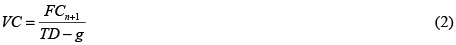 De acuerdo con Rojo (2002, p. 103) el valor continuo de la empresa ''es el valor esperado de sus flujos de caja tras el periodo concreto o finito de estimación. Estimar a futuro supone considerar el comportamiento de la empresa en términos de crecimiento de la misma''. La ecuación utilizada para calcular este valor a perpetuidad es la que incorpora la posibilidad de continuar su crecimiento, como se presenta en la ecuación 2: