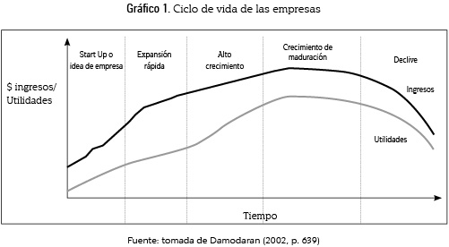 Como conclusión, las empresas a través del ciclo de vida, tienen necesidades diferentes de financiamiento, así como niveles de información para tomar decisiones; por ello, Damodaran (2002, p. 639), en el gráfico 1, presenta el ciclo de vida de las empresas y, complementariamente en la tabla 2, cuatro componentes de estas características propias de las empresas, representadas en el ítem de ingresos/operación corriente, cantidad de historia de la operación, existencia de empresas comparables y fuente de valor, los cuales son insumos necesarios para considerar el tema de valoración.