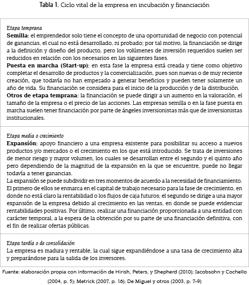 En la tabla 1 se presenta el ciclo vital de la empresa en incubación y su financiación que permite dar un marco de referencia de la importancia de una valoración adecuada de nuevos emprendimientos, dado que al hablar de emprendimientos existen varias clasificaciones que ayudan a entender el entramado y ecosistema que se pretende fortalecer en los países. En primer lugar, existe una clasificación por etapas que permite describir la empresa en qué momento se encuentra de acuerdo con el grado de inversión que contiene; estas se refieren a la temprana (inicio), media (crecimiento) y tardía (consolidación). Metrick (2007, p. 6) las describe de la siguiente forma: