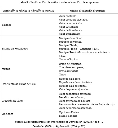 Con el fin de valorar una empresa, se enumeran a continuación los diversos instrumentos expuestos en la teoría financiera y empírica, dentro de los cuales se encuentran variantes o desarrollos de modelos y diferentes criterios al momento de obtener la información financiera requerida para hacer el análisis de la empresa. Por tal razón, se toma como referencia la clasificación de seis grupos de modelos y métodos de valoración elaborados por Fernández (2008, p. 4) y Jaramillo (2010, p. 211) expuestos en la tabla 3, los cuales fueron retroalimentados con otros métodos o modelos empíricos y académicos encontrados en la revisión bibliográfica. La estructura del escrito considera todas las alternativas de valoración de empresas como métodos.