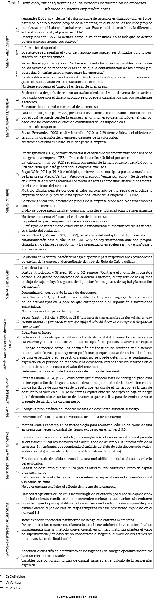 Sin embargo, las metodologías convencionales fueron diseñadas para valorar empresas que operan en mercados con amplia información financiera, incluso en el caso de pequeñas empresas, lo cual facilita la implementación de las metodologías, aunque autores como Damodaran (2002), Metrick (2007), Smith y Kiholm (2004) han propuesto metodologías especiales para empresas en etapas tempranas de emprendimiento y financiación. Es importante resaltar que en los países emergentes es poco común disponer de información de mercado, sumado a las diferencias en temas como características empresariales, estructura e historia en el tema de emprendimiento, y financiamiento en empresas riesgosas, pero usualmente, apuntan Gallinal, Moscoso, y Riaño (2011), en Colombia se aplican métodos de valoración basados en flujos de caja. A continuación, en la tabla 4, se presentan las principales características de los métodos de valoración convencionales y alternativos que se usan para valorar nuevos emprendimientos.