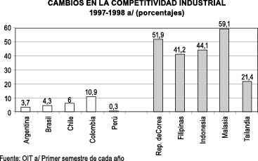 Los costos laborales calculados en dólares americanos se redujeron en varios países de la región debido a la devaluación monetaria. Aunque esto produjo ganancias de competitividad éstas fueron menos importantes que las ganancias registradas en los países del sudeste asiático, lo que explica la perdida de competitividad relativa de las economías latinoamericanas. Las mayores ganancias de competitividad en la región se registraron en Colombia (11%) mientras que en el Sudeste Asiático éstas fluctuaron entre un mínimo de 20% en Tailandia y un máximo de 60% en Malasia. {Gráfico 1)