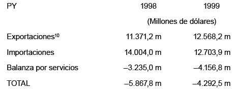 En 1998, se amplió el desequilibrio de la cuenta corriente de la balanza de pagos alcanzando el 6.6% del PIB. Esta situación se debió al aumento del déficit comercial en cerca de 1 punto del PIB y por el aumento en el déficit de servicios. Se espera para 1999 que el déficit de la cuenta corriente sea de aproximadamente US$ 3,805 millones, equivalente a 3.9% del PIB. Este es el resultado de los saldos negativos de la cuenta de bienes y servicios no factoriales, de US$ 1,643 y de la cuenta de la renta de los factores, de US$ 2,700 millones.