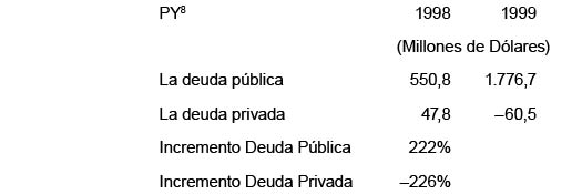 Este fenómeno estructural, del déficit fiscal asociado con la caída del ahorro público, aumenta los niveles de endeudamiento del gobierno, y lo sitúa para el presente año por el orden del 222% con relación a 1998. Este exagerado crecimiento es explicado principalmente, pollos créditos otorgados recientemente por la banca multilateral al país.