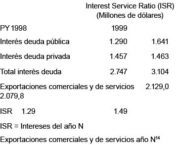 Entre 1998 y lo proyectado para 1999 se presenta una leve desmejora, al pasar del 42.2% al 43.1%, lo que significa, que del total de ingresos por exportaciones el país, está dedicando el 43% aproximadamente al pago de deuda pública.