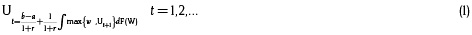 De acuerdo con Mortensen y Pissarides (1998, p. 12), Ut representa el valor de la búsqueda de empleo, b es el flujo de ingreso percibido por los agentes mientras se encuentran desempleados, a es el costo de búsqueda de empleo por período y W representa el valor generado por una oferta contractual. La estrategia óptima requiere encontrar aquel valor del contrato, Wt, que supera el valor de la búsqueda en un período posterior, Ut+1; por tal razón la búsqueda se detiene en el punto en el cual Wt > Ut+1