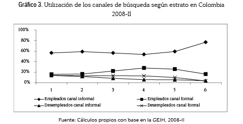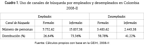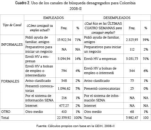 De acuerdo con la información de la GEIH 2008-II, aquellas personas que se encuentran empleadas han logrado ocuparse en un 73%, gracias a los canales informales; entre tanto, los desempleados prefieren usar canales formales. Es preciso anunciar que aquí puede estarse en presencia de un sesgo: los canales formales como los avisos clasificados, la entrega de hojas de vida a las empresas y las bolsas de empleo suelen ser medidas utilizadas en última instancia y de acuerdo con la duración del desempleo, estas tenderán a ser empleadas por quienes no tienen empleo, no obstante los canales informales son más efectivos debido a que a los empleados no se les pregunta cuáles canales utilizaron, sino mediante cuál canal obtuvieron el empleo en el que se encuentran laborando.