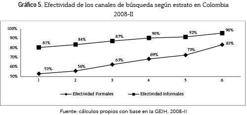 En contraste, el uso de canales formales presenta la forma de una ''u'' invertida en la cual los empleados de los estratos 4 y 5, presentan una utilización del 28% y 26%, y los desempleados de un 13% y 10%, respectivamente. A grandes rasgos se puede decir que los canales formales son los más utilizados por los individuos de estratos 4 y 5, pero solo la décima parte de ellos obtiene empleo a través de estos canales.