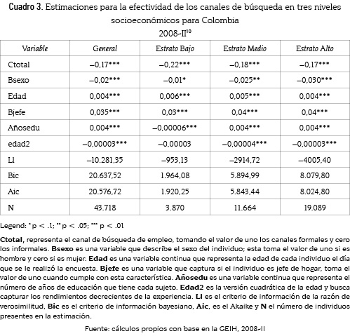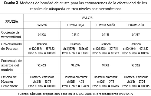 Un método más sofisticado para identificar la efectividad de los canales de búsqueda es estimar la probabilidad de conseguir empleo a partir de métodos formales e informales (cuadro 3); para ello se estimó un modelo de elección discreta para cada nivel socio-económico (alto, medio y bajo), el modelo no solo presenta el efecto de los canales de búsqueda en la probabilidad de estar ocupado, sino que, además, intenta verificar el efecto de las variables demográficas del individuo y aquellas variables que determinan su salario de reserva (véanse pruebas de bondad de ajuste en el anexo B).