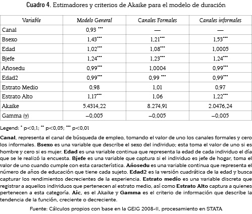 De acuerdo con la estimación se puede decir que los canales formales reducen la probabilidad de salir del desempleo en el tiempo. Ser hombre y ser jefe de hogar hace que sea probable conseguir empleo más pronto, y esta probabilidad aumenta si se utilizan canales informales; esto se debe a que las responsabilidades del hogar reducen el salario de reserva del individuo y, por lo tanto, lo hacen propenso a aceptar más rápido una oferta de empleo.