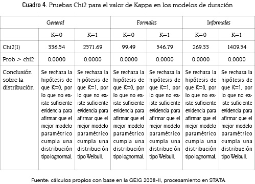 Se observa que, en términos generales, la duración del período de desempleo presenta un decrecimiento monótono por lo que la probabilidad de permanecer desempleado se reduce a medida que pasa el tiempo. Aunque en magnitudes marginales, los canales de búsqueda formales parecen retrasar más la posibilidad de obtener un empleo. En particular, mientras que al utilizar canales informales, un cesante tiene una probabilidad de encontrar empleo a las 13 semanas del 43,63%, un individuo que utiliza canales formales encuentra empleo con una probabilidad del 40,44%.