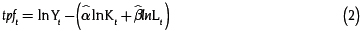 Donde Yt, Kt, Lt y tpft representan, respectivamente, el PIB real, el valor real del acervo de capital, el nivel de empleo y el logaritmo de la productividad total de los factores (residuo de Solow), observados en el momento t. Los parámetros de la función de producción (las elasticidades α y β) son desconocidos y deben estimarse. Como menciona Acevedo (2009) una alternativa para su estimación es suponer que la función de producción tiene rendimientos constantes a escala (es decir ) α + β = 1) y que existe competencia perfecta. Así α y β podrían obtenerse de forma directa de las cuentas nacionales, ya que representarían la participación del trabajo y del capital en el ingreso nacional, respectivamente.