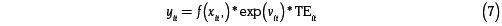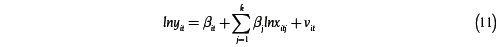 corresponde a la especificación de una frontera de producción estocástica, donde yit es el output de la unidad de producción i en el momento t, x es el vector de insumos, β los parámetros de la función de producción, y exp(vit) es la parte específica al productor que captura el efecto de un shock aleatorio en el momento t sobre el productor i. La especificación de la ecuación (7) permite que la diferencia entre el nivel de producto observado y el máximo factible no sea atribuida solo a la ineficiencia técnica. Esta especificación considera que el output puede ser afectado por choques aleatorios, los cuales no están bajo el control del productor.