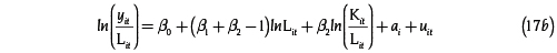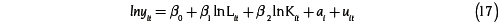 Si se especifica una función de producción Cobb-Douglas, la frontera estocástica con eficiencia técnica cambiante en el tiempo puede escribirse de la siguiente forma: