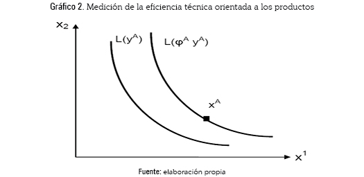 Con múltiples insumos y un solo producto, como es el enfoque de análisis de eficiencia que se adopta en este artículo, la eficiencia técnica ET(xA, yA) mide la máxima expansión de yA (la producción del bien y de la unidad productiva A) que es posible con la combinación de insumos xA. Para medir ET(xA, yA) se compara la producción del par de isocuantas en el gráfico 2: