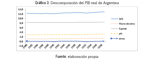 • Del gráfico 3 se puede concluir que el aporte de la ptf al PIB real en Argentina es superior al aporte la mano de obra, lo que resalta la importancia de la productividad total de los factores al crecimiento económico.