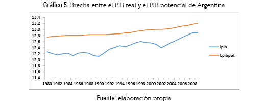 • En el gráfico 5 se muestra la brecha el PIB potencial en Argentina, que resulta de sumar a la productividad total de los factores el aporte técnico esperado.
