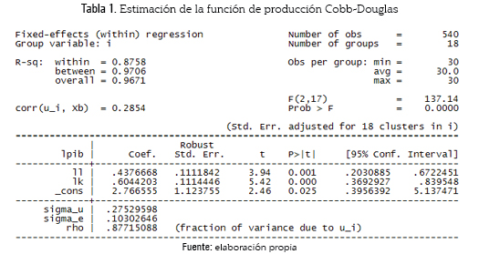 El primer paso consistió en la estimación de la función de producción con la técnica de efectos fijos para datos panel. Los resultados se muestran en la tabla 1.