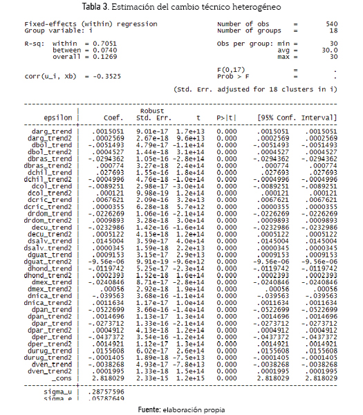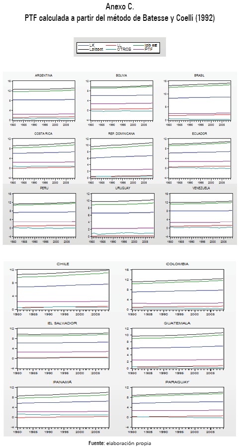 En general, para la muestra de datos anuales desde 1980 hasta 2009, puede concluirse una ligera caída en la eficiencia técnica en la productividad total de los factores para la mayoría de los países. Los países más eficientes son Panamá, Uruguay y México, y los más ineficientes son Nicaragua, Bolivia, Honduras y Paraguay.