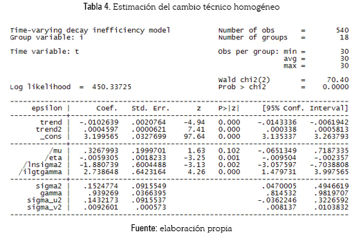 Es decir, se asume que no existe heterogeneidad en el cambio técnico, para ser coherente con la especificación de Batesse y Coelli (1992).