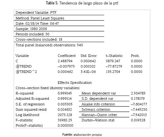 La tabla 5 presenta los resultados de la estimación de tendencia de largo plazo de la ptf calculada con la frontera estocástica. Se evidencia una tendencia de largo plazo creciente. Un comportamiento similar tiene la tendencia de largo plazo de la ptf calculada con la técnica de Cornwell, Schmidt y Sickles (1990).