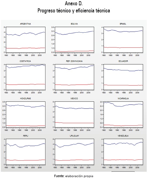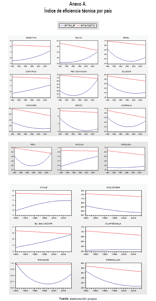 El anexo A muestra los gráficos del índice de eficiencia técnica variable a través del tiempo para los 18 países, estimados con frontera estocástica y la técnica de datos panel y efectos fijos. En la eficiencia técnica calculada a partir del método de Batesse y Coelli (1992), todos los países sufren una leve disminución de la eficiencia técnica con el pasar de los años. Los cálculos a partir del método de Cornwell (Schmidt y Sickles, 1990) reportan mejoras en la eficiencia técnica a través del tiempo en Argentina, Costa Rica, Ecuador, Bolivia, Chile y Uruguay, y una tendencia decreciente en el resto. Los mayores índices de eficiencia se encuentran en Panamá, Uruguay y México, y los más ineficientes son Nicaragua, Bolivia, Honduras y Paraguay. La situación de Nicaragua, Honduras y Paraguay es la más crítica, porque están entre los más ineficientes, y su ineficiencia empeoró en el tiempo.