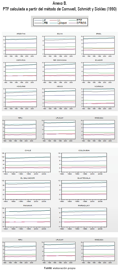 Para la estimación de la frontera de producción estocástica, con las aproximaciones de Cornwell, Schmidt y Sickles (1990) y Batesse y Coelli (1992), se utilizó información de datos panel para el período 1980-2009 del PIB real, el acervo de capital y el empleo de 18 países latinoamericanos: Argentina, Bolivia, Brasil, Chile, Colombia, Costa Rica, Guatemala, República Dominicana, Ecuador, Honduras, México, Nicaragua, Salvador, Panamá, Paraguay, Perú, Uruguay, Venezuela. Por consiguiente, la eficiencia técnica, la productividad total de los factores y el PIB potencial se estimaron para este período de tiempo y para estos países.