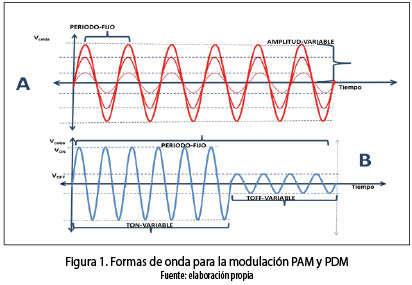 La modulación PAM (Pulse Amplitude Modulation) consiste en el ajuste de la potencia mediante la variación de la amplitud de los pulsos de voltaje aplicados a la celda DBD manteniendo la frecuencia constante (Ver figura 1A). La modulación PDM (Pulse Density Modulation) consiste en el ajuste de la potencia mediante la sucesión de pulsos de alta frecuencia durante un tiempo TON y con pulsos atenuados en amplitud durante un tiempo TOFF. El período de tiempo de la onda PDM es constante y corresponde a la suma de los tiempos TON y TOFF (Ver figura 1B). La potencia varía conforme a la relación del ciclo de trabajo D= TON /(TON+TOFF).