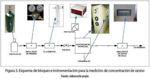 El montaje neumático se detalla en la Figura 3. Esquema de bloques e instrumentación para la medición de concentración de ozono y comprende una fuente de oxígeno, un regulador de presión, un medidor de flujo, una válvula de ajuste, un generador y un analizador de ozono. El flujo de entrada de O2, al cual se aplicaron los experimentos, es de 1L/min y se asume que el mismo flujo se presenta a la salida del generador.