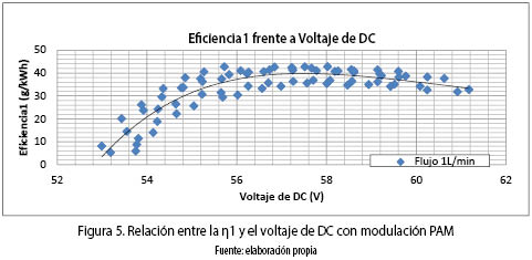 En la metodología experimental se realizó la caracterización estática del sistema bajo la modulación de potencia PAM, con el fin de obtener la curva de eficiencia descrita por el sistema e identificar el rango de condiciones de operación óptimas. En la Figura 5 Relación entre la η1 y el voltaje de DC con modulación PAM se muestra la relación entre la eficiencia η1 a la entrada del inversor y el voltaje de DC cuando se utiliza modulación PAM. Se observa que ante un aumento del voltaje de DC la η1 también se incrementa y dicho comportamiento se mantiene hasta el punto máximo en 40gO3/kWh para un voltaje DC de 56,4V. Finalmente la eficiencia permanece constante en un rango de máxima eficiencia hasta 58,2V, punto a partir del cual la eficiencia decae hasta 32g/kWh con un voltaje de 61V al final del rango evaluado.