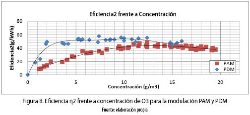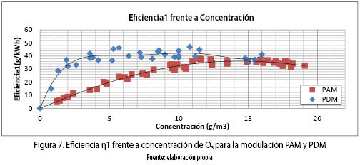 Los resultados anteriores muestran para el caso de PAM que existen un conjunto de puntos en los cuales la eficiencia es alta. Estos corresponden a valores de concentración de ozono mayores a 12g/m3; de igual manera se observa que para concentraciones mayores a 16g/m3 la eficiencia decae; este efecto puede ser causado por calentamiento de la celda y a que no se opera a un campo eléctrico reducido óptimo [7]. Para el caso de PDM se presentó un mejoramiento de la eficiencia respecto a PAM en el rango entre 0 y 16g/m3 el cual corresponde a un mejoramiento del 60 % del rango analizado; este mejoramiento se atribuye a la aplicación de una amplitud de voltaje óptima en los pulsos durante el tiempo TON de la técnica PDM. Sin embargo, en el rango de concentraciones entre 0 y 2 g/m3 la eficiencia es relativamente baja, lo cual puede estar relacionado con que los tiempos TON de la modulación PDM son muy cortos y no permiten una descarga estable.