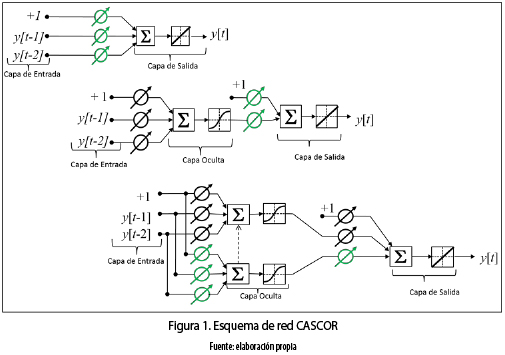 Los modelos de redes neuronales han sido ampliamente usados para representar y predecir series de tiempo con características complejas; específicamente en el mercado de la electricidad se ha informado de su uso en [1] . Sin embargo, la estimación de los parámetros óptimos del modelo en las tradicionales redes neuronales, tipo perceptrón multicapa –MLP– es un problema particularmente difícil, no solo por la complejidad propia del proceso de optimización, sino también porque los parámetros no son únicos. La red neuronal artificial tipo cascada correlación – CASCOR– [6] presenta ventajas conceptuales interesantes en relación con el problema de estimación del MLP. CASCOR está diseñada bajo el esquema de crecimiento en el tamaño de la red o aprendizaje constructivo, donde no es necesario de conocer a priori el número de neuronas ocultas requeridas, de modo que el aprendizaje puede ser más rápido y puede tener una mejor capacidad de generalización de un MLP.