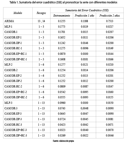 Los resultados de la tabla 1 muestran que en los modelos con tres rezagos, el CASCOR–EP+RC–1 es el que obtiene el menor error en entrenamiento y de pronóstico a 2 años, mientras que con el CASCOR–RC–1 se obtiene el menor de pronóstico a un año; no obstante, el error de pronóstico a un año del modelo CASCOR–EP+RC–1 es tan solo 4 % mayor que el menor en modelos de 3 rezagos. Además, todos los modelos CASCOR de tres rezagos tienen mejor generalización que el MLP–1; asimismo, los modelos CASCOR–DP–1 y CASCOR–EP+RC–1 son superiores al modelo ARIMA, tanto en entrenamiento como en pronóstico; los demás solo son superiores en predicción. Al aumentar la cantidad de rezagos, a seis y a trece, se observa que los modelos CASCOR siguen siendo superiores al respectivo MLP, incluso, también lo son respecto al ARIMA.