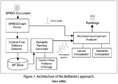 The BeMantics approach receives semantically annotated BP described in the BPMO (business process modeling ontology) language which is based on the BPMN notation (BP modeling notation). Therefore, the semantics comparison estimates a linguistic (lexical and semantics) distance between names and interfaces of two BP. Regarding, the structural comparison, it has a slightly difference with the StCoBP one, because d their r uses the A* algorithm to find inexact matching by editing nodes and edges of the BP in order to generate a BP similar to a query BP; while StCoBP uses the VF2 graph isomorphism algorithm which only find exact matches between substructures of the compared BP. Additionally, the BeMantics approach includes a behavioral semantics BP repository which executes an indexing mechanism based on control–flow patterns and its semantic relations. The main modules of this approach are presented in figure 1.