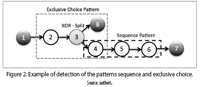 • Control–flow patterns detector: this module receives as input a process graph and returns a set of detected patterns. The control–flow patterns are sub–structures composed of activity nodes, connector nodes and edges representing a specific execution behavior of the BP. For example, figure 2 shows an example of the detection of two patterns, the exclusive choice and the sequence pattern in a BP. As can be seen the control–flow patterns are only sub–structures that can be detected inside the full structure of the BPs.