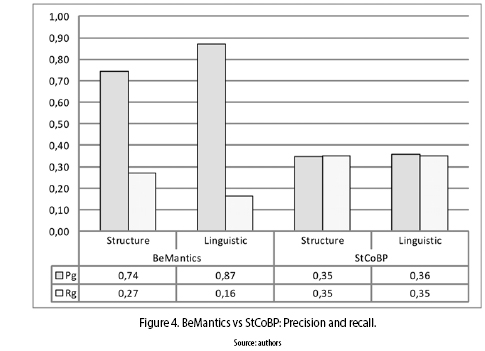 The relevance of the results obtained by BeMantics and StCoBP are evaluated using the recall (Rg) and precision (Pg) measures. Precision (equation 1) estimates the ability of the system to retrieve only relevant elements (i.e. elements considered as relevant by human judges), while the recall (equation 2) evaluates the ability of the system to retrieve all the relevant elements avoiding missing relevant results.
