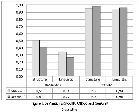 • ANDCG and GenAveP': Regarding the ANDCG and GenAveP measures, figure 5 shows that StCOBP has better ranking quality than BeMantics. This is because unlike BeMantics, the StCoBP approach assigned greater values for the first elements and reduces the value to the latest elements in the output ranked list. Therefore, it can be observed that although BeMantics was more accurate (greater values of Pg) than StCoBP, this last one arranged the ranking results in a similar way than human judges did. This is important having into account persons put more attention on the first items of a search results.