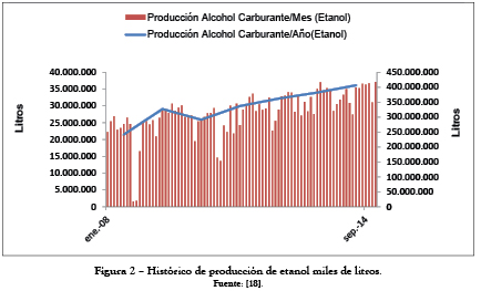 La figura 2 nos muestra el crecimiento que ha tenido la producción de etanol en Colombia, a partir del año 2005 cuando fue implementado el programa de biocombustibles. Se observa un pico importante en el año 2009 cuando la producción de caña en el país fue de 23.588.646 de toneladas. La caída de 2010 se explica por la caída de la producción de caña para ese año y la siguiente recuperación en la producción de azúcar de caña para el año 2011 cuando la producción de caña alcanzó 22.728.758 toneladas de caña en el territorio nacional, tendencia que se ha mantenido al alza desde entonces.