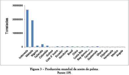 La producción mundial de aceite de palma para el año 2013 está liderada por Indonesia y Tailandia con rangos de producción de entre 19 y 26 millones de toneladas. Como principales productores de aceite de palma, Malasia e Indonesia suman 50,4% de la producción mundial de aceite de palma y Colombia estaba en el año 2013 con una participación 945.064 toneladas lo que corresponde a 33,4% de la producción total de aceite de palma en América Latina (figura 4).