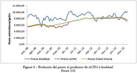 La estructura de precios del aceite combustible para motores (ACPM), con biodiésel, está basada en los costos de oportunidades de las materias primas utilizadas en la producción del biocombustible y del costo de oportunidad del ACPM, además de la garantía en la recuperación de las inversiones reglamentadas por la Resolución 181.780, de 29 de diciembre de 2005, modificada por la Resolución 180.212 del 14 de febrero de 2007 y 182.158 de 28 de diciembre de 2007. En función de estas resoluciones el precio de los biocombustibles es muy dependiente de los precios de las materias primas.