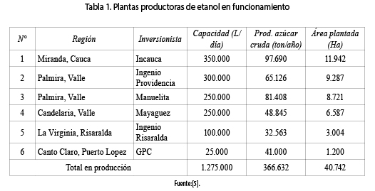 En la actualidad Colombia cuenta con 14 ingenios azucareros, 13 de ellos ubicados en el valle del río Cauca, localizados así: 2 en el departamento de Cauca, 10 en el Valle del Cauca, 1 en Risaralda y 1 situado fuera del valle del río Cauca en el departamento del Cesar. La tabla 1 muestra las plantas productoras de azúcar y etanol actualmente en funcionamiento como también su capacidad diaria y área plantada.