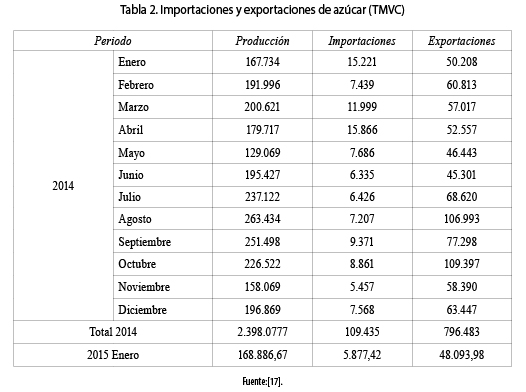 La tabla 2 nos muestra que la producción de caña de azúcar ha tenido altos y bajos debido a la variabilidad, que hace que los rendimientos en los departamentos productores bajen observándose una disminución 27.982 toneladas métricas de volumen crudo (TMVC) entre los meses de diciembre de 2014 y enero de 2015. Con respecto a las importaciones, estas cayeron en los meses siguientes a mayo de 2014, llegando a un mínimo en el mes de noviembre (5.457 TMVC) aun cuando la producción de azúcar estaba en 158.069 TMVC en el mismo mes. Con las exportaciones del producto vemos que el mayor volumen de producto exportado fue en los meses de agosto y octubre cuando la producción estaba entre 106.993 y 109.397 TMVC.