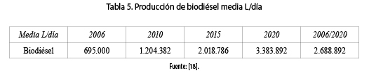 El área sembrada de palma africana aumenta año a año alcanzando alrededor de 664 mil hectáreas en 2015, y la producción de biodiésel, según previsiones, debe alcanzar 2 millones de litros por año a partir del 2015, conforme a las tablas 4 y 5.
