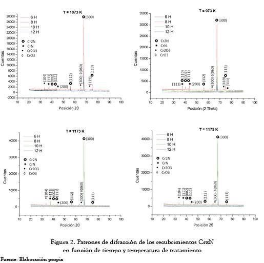 Se encuentra, además, formación de óxidos de cromo tipo Cr2O3 y CrO3, en los diferentes tratamientos. Los experimentos se realizaron a bajo vacío (9 Torr) por lo cual existe presencia de oxígeno dentro de la cámara de tratamiento durante la nitruración gaseosa. Sin embargo, estos óxidos (en particular la fase Cr2C3) muestran tendencia a desaparecer con el incremento de la temperatura de tratamiento. Este fenómeno ha sido observado en [20] donde se establece una ligera influencia del hidrógeno en esta reducción, elemento que se genera como subproducto de la disociación de amoniaco durante los tratamientos de nitruración realizados. Estas fases fueron comparadas con los patrones de referencia 00-001-1294 para el Cr2O3 y 00-001-0622 para el CrO3.