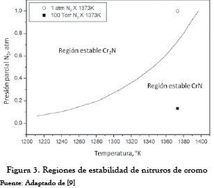 Se observa, para las diferentes temperaturas de tratamiento, la formación de un sistema bifásico CrN + Cr2N lo cual coincide con los trabajos realizados por [12] y [15]. Este hecho obedece a que el incremento de la temperatura favorece la disociación de NH3 y, por tanto, la actividad de nitrógeno en la atmósfera de tratamiento [15]. La aparición de una u otra fase obedece a la inestabilidad termodinámica que se presenta en función de la temperatura y la presión parcial del gas precursor tal como se ha descrito en [15], donde a partir de cálculos termodinámicos utilizando N2 como gas precursor se obtienen regiones de estabilidad de los nitruros de cromo, como se muestra en la figura 3. Se observa que la formación de fase Cr2N se favorece a menor temperatura de tratamiento y menor presión parcial de gas precursor, como en los tratamientos realizados en este trabajo con temperaturas variables entre 873 K y 1173 K, con una presión parcial de 1,2 kPa.