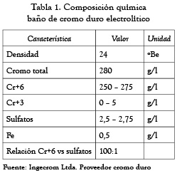 Los recubrimientos de Cr(VI) duro aplicados sobre el acero AISI H13 se produjeron por vía electroquímica en un baño electrolítico según la composición mostrada en la tabla 1, a una temperatura de 40 °C, con densidad de corriente catódica de 30 A/dm2 y duración de 80 min. El espesor de recubrimiento fue de aproximadamente 15 µm y se seleccionó con base en criterios de utilización para aplicaciones en manufactura relacionadas con el acero seleccionado (AISI H13).