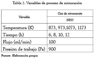En la primera parte del tratamiento termoquímico, las probetas cromadas fueron sometidas a limpieza ultrasónica con una fase inicial de desengrase con acetona GR para análisis y un enjuague posterior con 2-propanol GR para análisis (cada fase con duración de 1 minuto). Se realizó vacío hasta un valor de presión base de 2,5 Pa. Simultáneamente, se establecieron en el sistema de control los valores de temperatura, y tiempo de proceso (en minutos), y se seleccionó el gas portador de nitrógeno (NH3). Mediante la válvula del flujómetro y la válvula micrométrica de aguja se estableció el valor de flujo de gas que para los diferentes experimentos se mantuvo en 100 ml/min. La presión de trabajo fue 9x102 Pa. Los experimentos se desarrollaron variando la temperatura y el tiempo de tratamiento, de acuerdo con los valores mostrados en la tabla 2.